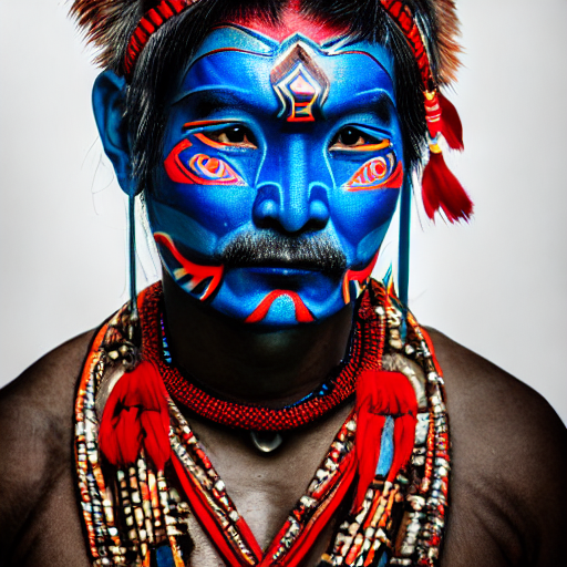 portrait photo of a asia old warrior chief, tribal panther make up, blue on red, side profile, looking away, serious eyes, 50mm portrait photography, hard rim lighting photography--beta